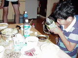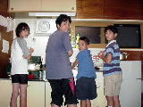 バンガローでの夕食作りは、普段の家庭での料理作りとなんら変わりません。このバンガローの作りは、1階が8畳くらいで、食事をとるテーブルと、布団を敷くスペースがあり、はしごを上っての2階にも布団を敷くスペースがあります。寝具(毛布だけ)は6人分なので、6人用というところでしょう。