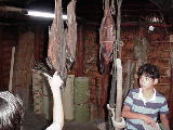 ここは、無料でみられる資料館前のアイヌの住居を復元したもの。囲炉裏の上にほしてあるのは、まぎれもない、これこそスモークサーモンでした。すっかり真っ黒になっていたけど、鼻を近づけるとしっかりとスモークサーモンの匂いがしました。