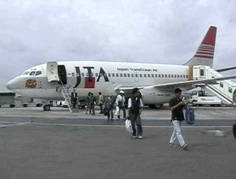 石垣空港に到着。飛行機を降りると、南国独特の空気が・・・。