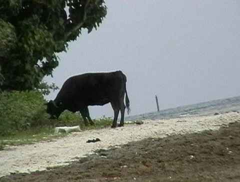 竹富島の海岸を自由に散歩する牛。これ以上ののどかな風景は、ない。さんごの砂浜は真っ白で目が痛くなるほど。星砂がとれた。