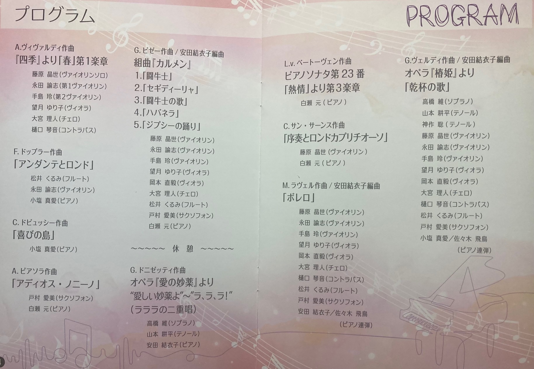 コンサートではラウンジ黎から巣立って、プロとして活躍している若手音楽家10数人が演奏しました。 東京藝術大学を優秀な成績で卒業した人が多く、ベルリンフィルで演奏しているバイオリニスト 藤原さん、ピアノの白瀬さん、サクソフォンの戸村さんの演奏がとくに印象に残りました。