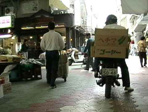 那覇市牧志公設市場付近。へちまとゴーヤー(ニガウリ)の入った箱を積んで走っているところが何とも沖縄らしい。食堂で使うのだろうか?